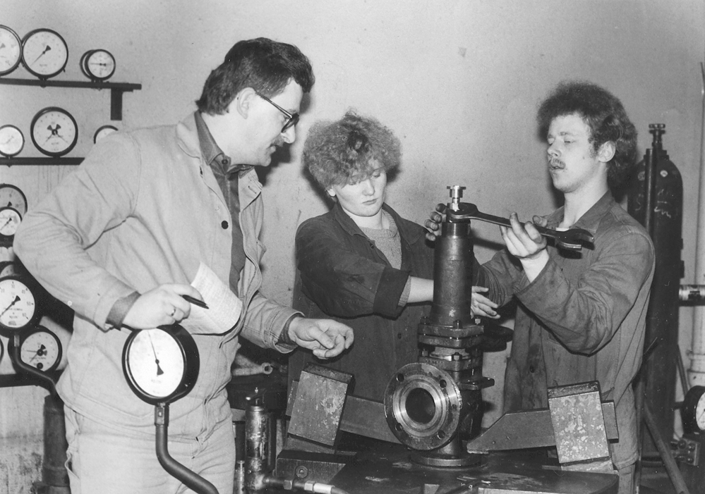 In der Betriebsberufsschule (BBS) des VEB Synthesewerk Schwarzheide wurden auch BMSR- (Betriebs-, Mess- und Regel-) Techniker ausgebildet. Hier an einem Übungsgerät in der Ausbildungsstätte der Betriebsberufsschule, damals die BMSR-Baracke. Der Facharbeiter für Betriebsmess-, Steuerungs- und Regelungstechnik war ein Ausbildungsberuf in der DDR. Es handelte sich um einen Elektroberuf, der zusätzlich mit mechanischen Kenntnissen erweitert war, um den speziellen Anforderungen der Wartung von Mess- und Regelungstechnik in Großbetrieben gerecht zu werden. Zum Aufgabenprofil des Facharbeiters für BMSR-Technik gehörten Arbeiten an elektrischen, elektronischen, pneumatischen, hydraulischen und rein mechanischen Systemen. In größeren Betrieben war der Zuständigkeitsbereich des BMSR-Technikers klar vom Elektriker und vom Schlosser abgegrenzt.