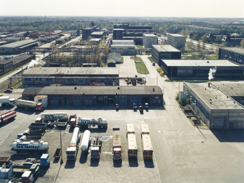 In unmittelbarer Nähe zum Wasserturm befand sich der Bereich für den Transport und Verkehr des VEB Synthesewerks Schwarzheide. Dieser war unter anderem zuständig für den Transport der Beschäftigten vom Wohnort zum Werk und zurück. In der werkseigenen Kfz-Werkstatt wurden auch diese Busse repariert. Hier galt es mitunter zu improvisieren, denn Ersatzteile waren rar.