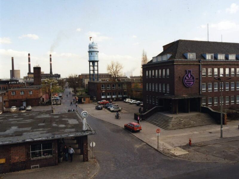 Diese Aufnahme zeigt den Polyurethankomplex im Jahr 1991. Die Anlagen wurden von 1968 bis 1973 errichtet. Polyurethane gehören seitdem zum Produktportfolio des Standortes.